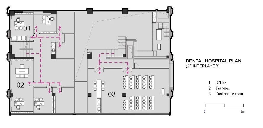 室內(nèi)的墻面具有不同的透明度:從等候區(qū)域可以看到接待臺(tái)后方的診區(qū);實(shí)驗(yàn)室和器材消毒中心的部分玻璃隔墻覆蓋以半透明的白色薄膜,為醫(yī)務(wù)人員提供了半私密的工作環(huán)境。傳遞了診所公開(kāi)透明的理念。