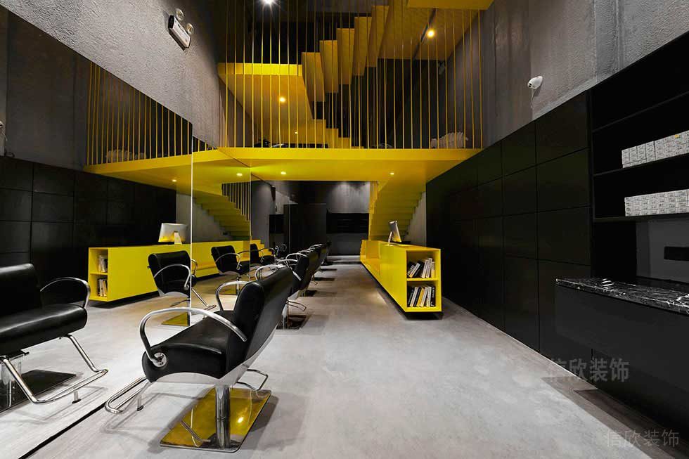 由外往內(nèi)一望,巨大的黃色樓梯裝置如雕塑般躍然于空間之中,強烈的視覺沖擊力營造出新都市時尚感,油然而生的想法:這是一個很酷的美發(fā)空間。