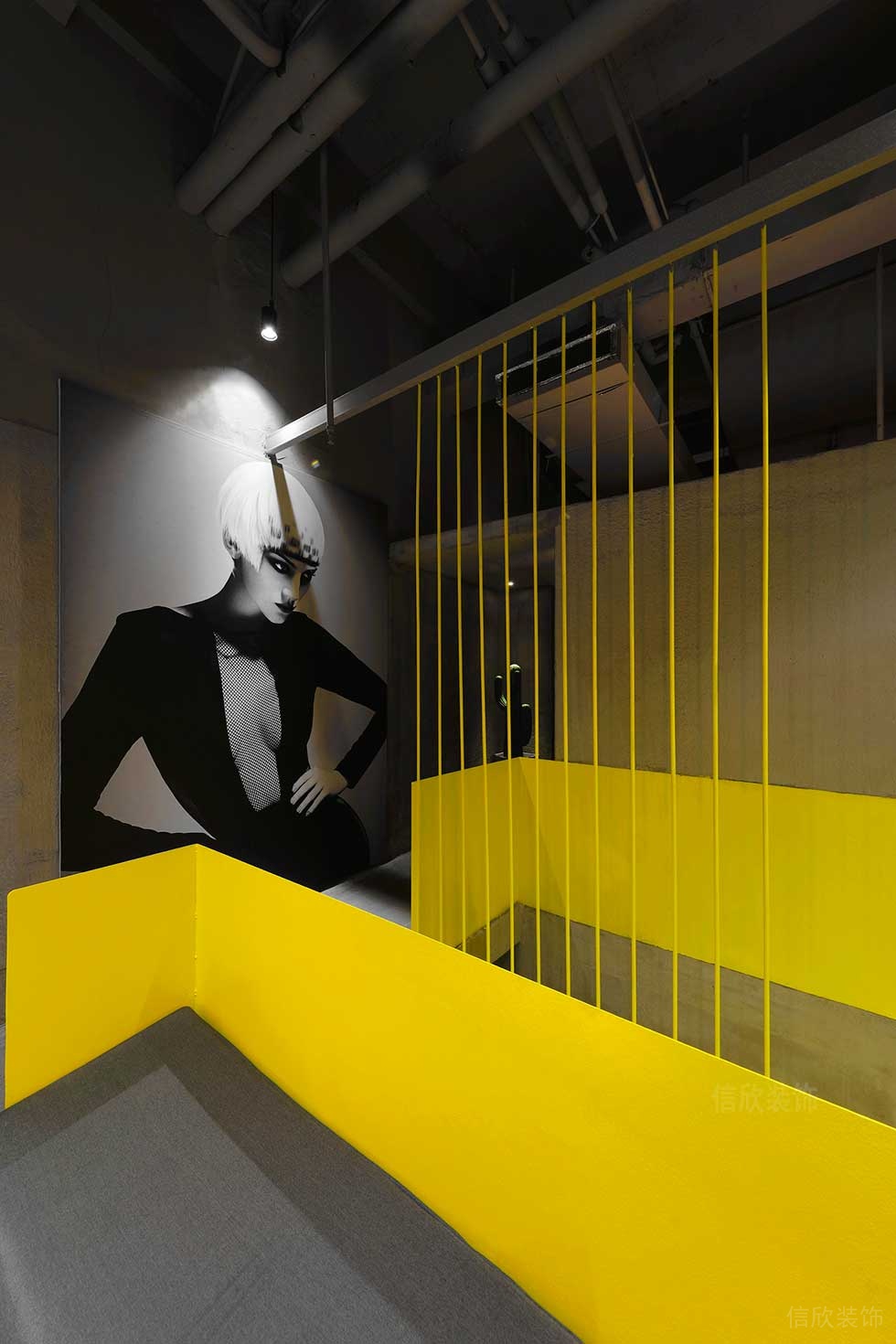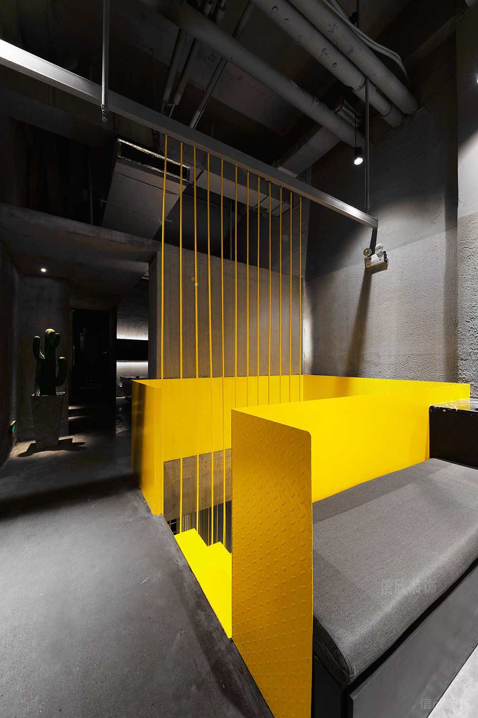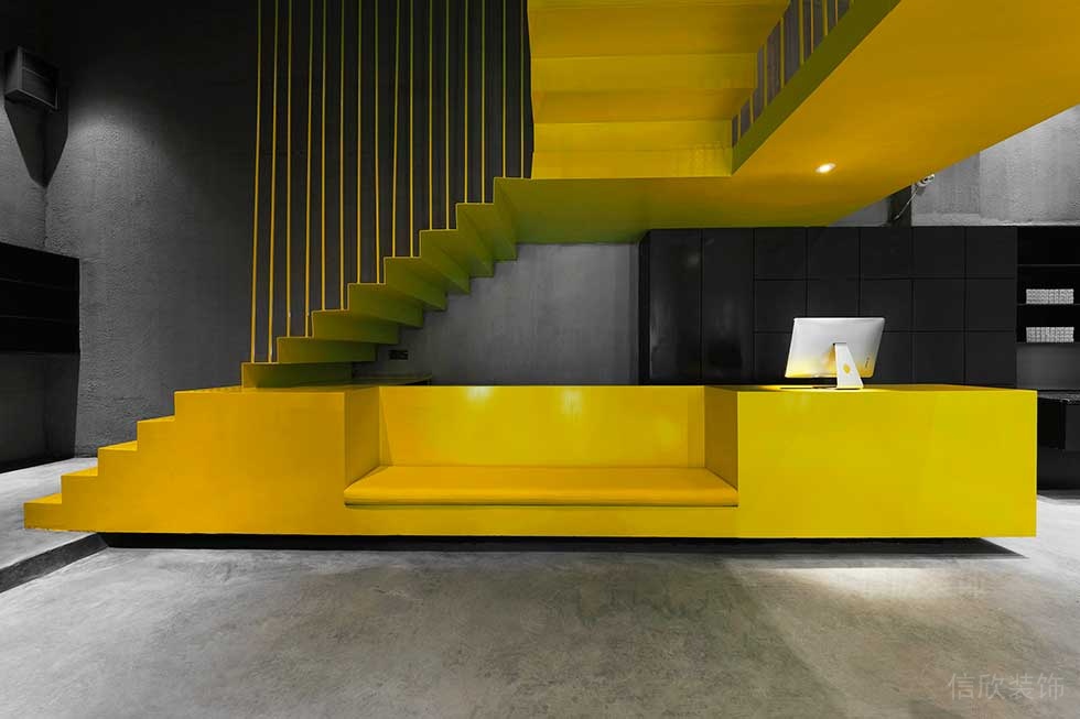 黃色的前臺,如陽光板明媚和閃耀的顏色,在灰色水泥結(jié)構和黑色的整體空間,猶如注入了一絲耀眼的光芒,色彩絢麗,顯得時尚而美觀。