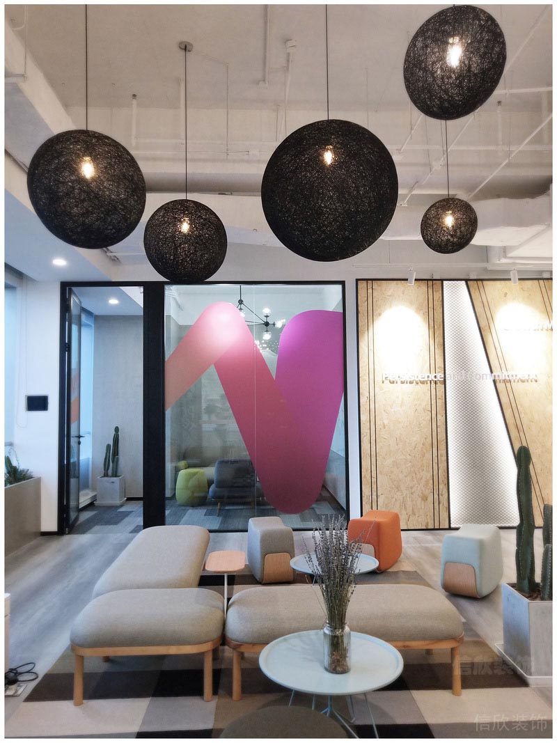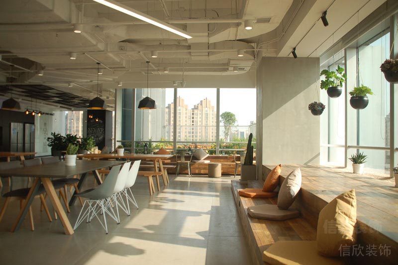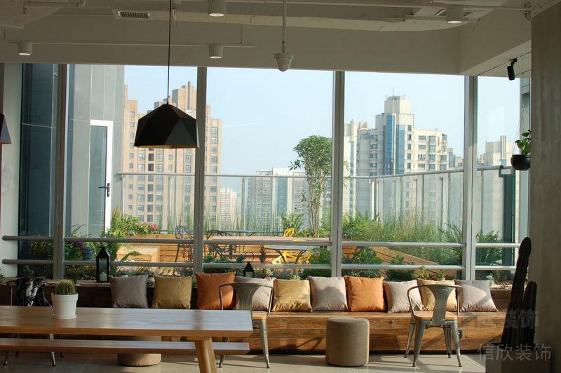 本案位于深圳市是一所田園風(fēng)格的辦公室裝修設(shè)計(jì)案例,在墻面上大量使用玻璃墻,使空間的通透性強(qiáng),人們可以通過玻璃看到窗外的世界,使辦公空間與室外自然環(huán)境在一定程度上達(dá)到相互融合。同時(shí),室內(nèi)植物在陽光的照射下形成自然的光影,對辦公空間有一定裝飾性。