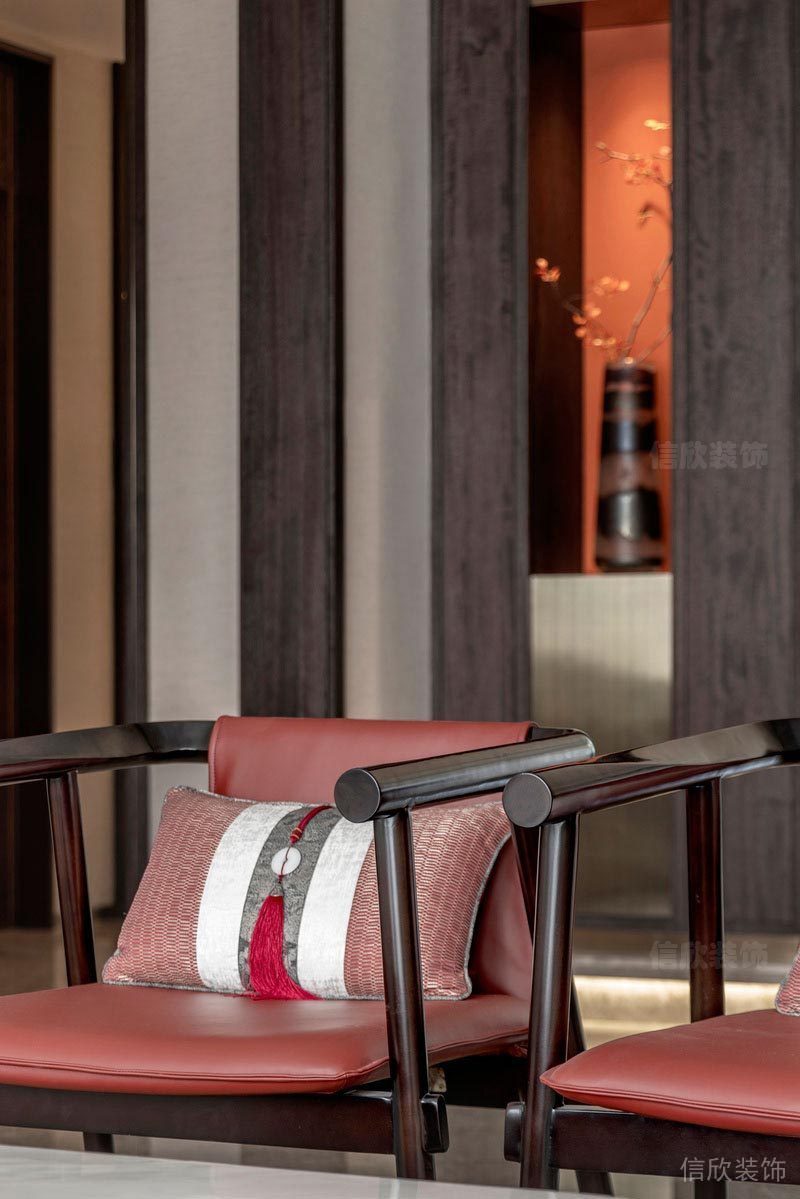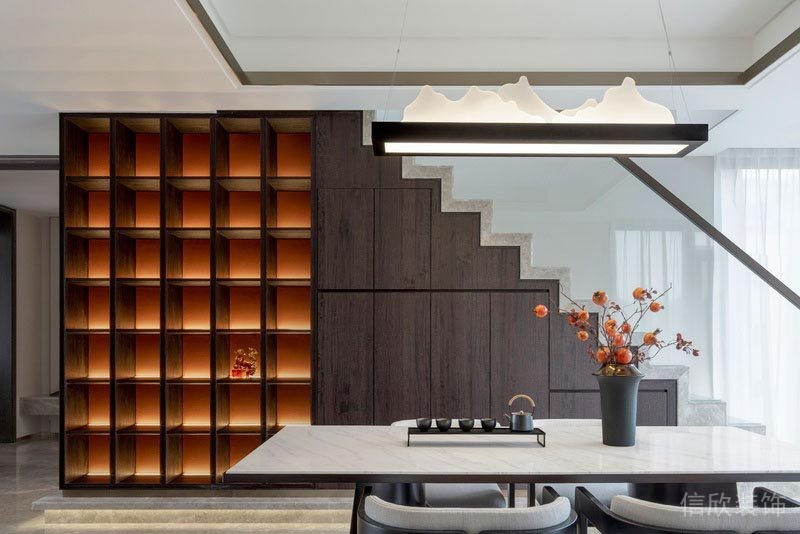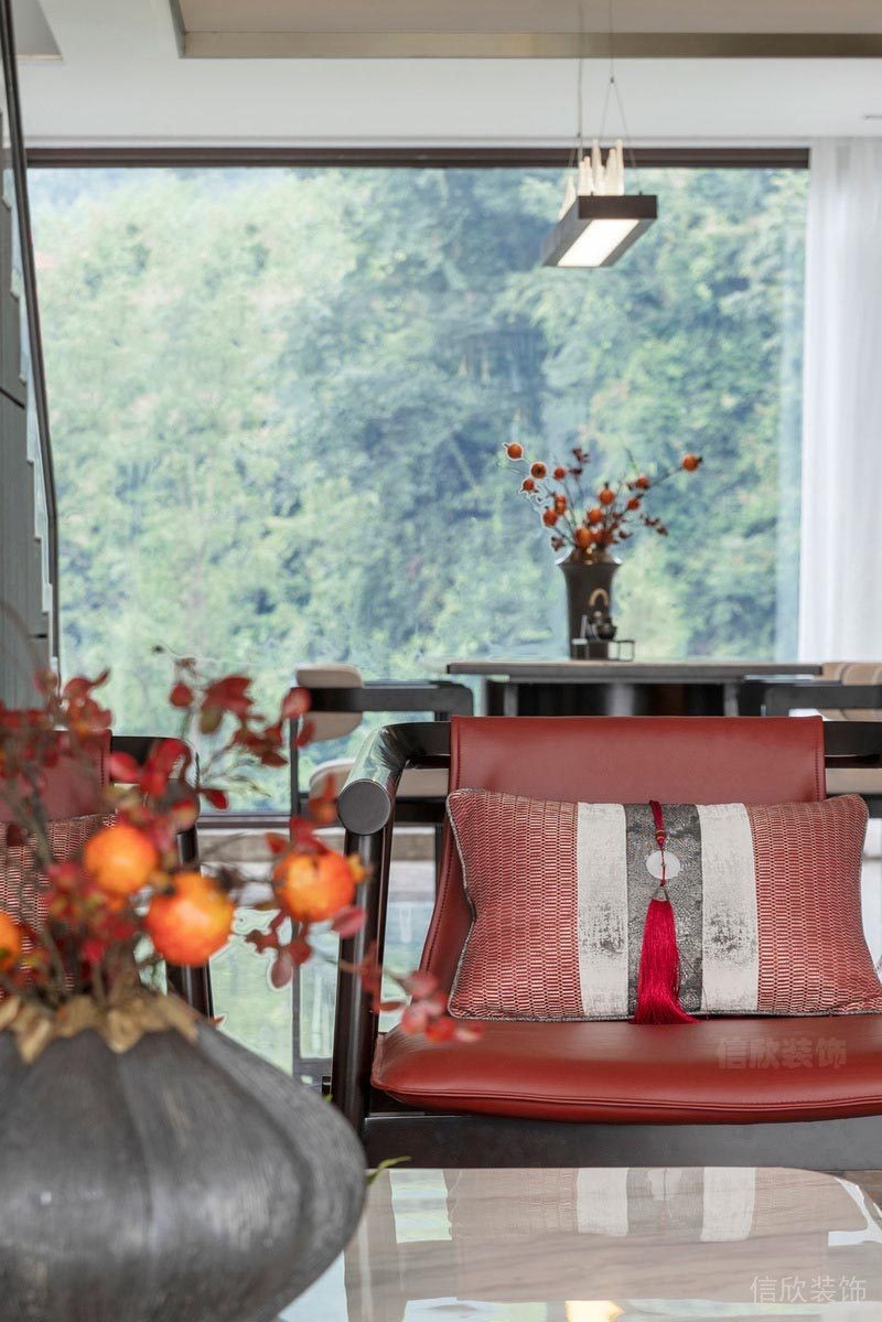 穿過玄關,進入過廳,左邊便是餐廳。實木布藝軟包座椅,極具設計感的扶手造型,碩果累累的鮮紅色石榴花藝,精致典雅的陶藝茶具,散發著濃郁的東方文化情懷。餐桌上方的半透明亞克力山形吊燈,與窗外的青山遙相呼應,在與自然的對話中,感受“久在樊籠里,復得返自然”的那份閑適與自在。