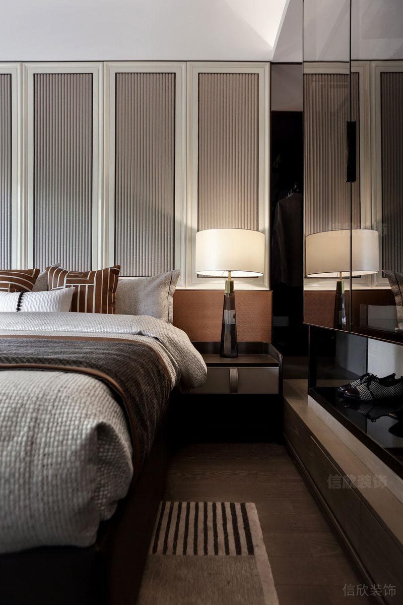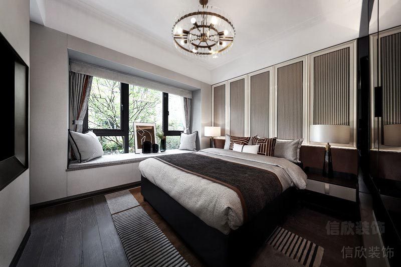 深圳市寶安區西鄉榕江壹號院主臥 溫馨的布藝床,舒適而實用,仿古吊燈造型簡潔而沖擊感墻,木藝背景墻簡單而線條優美流暢。