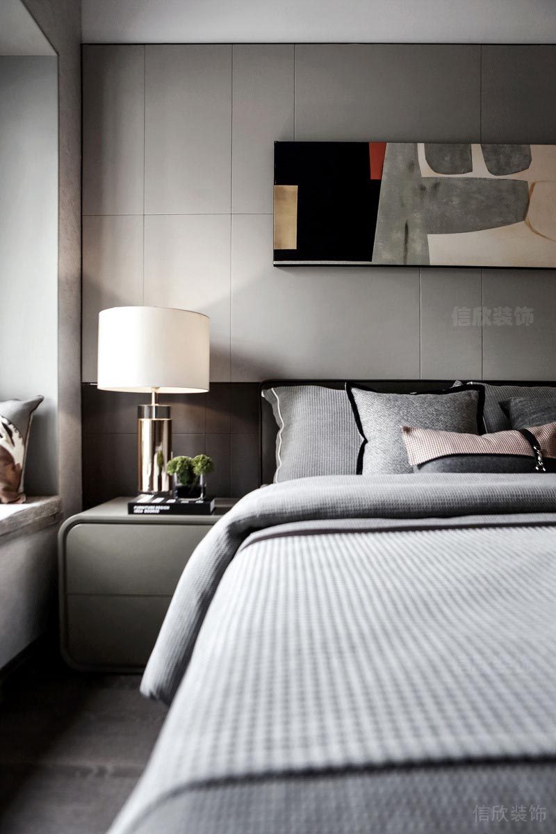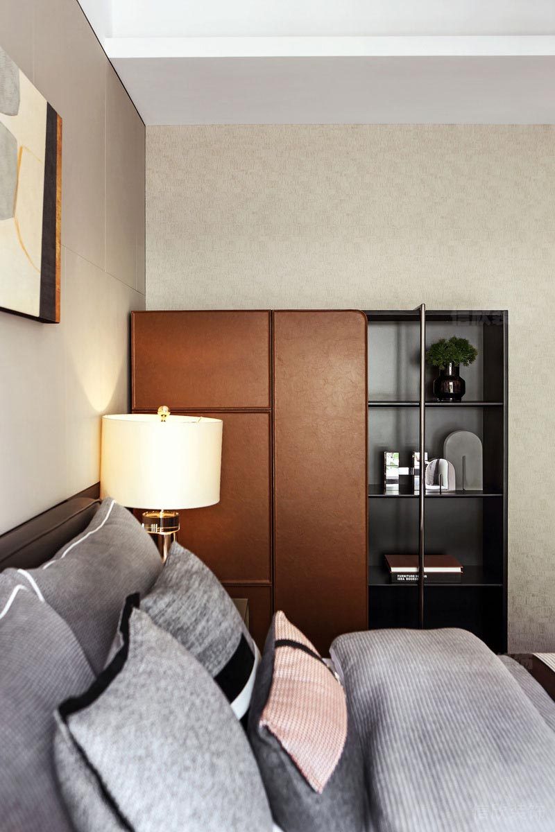 深圳市寶安區西鄉榕江壹號院次臥 灰色調為主題的次臥,冷傲而高雅,造型吊燈,中性色的柜子,配合明亮日光充足的環境;詮釋出精神世界的追求和氣質。