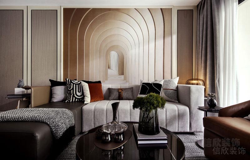 在視覺上舍棄張揚,通過對線條與色塊的巧妙應用,營造出輕松的空間氛圍,傳遞“輕奢華、新時尚”的生活理念。