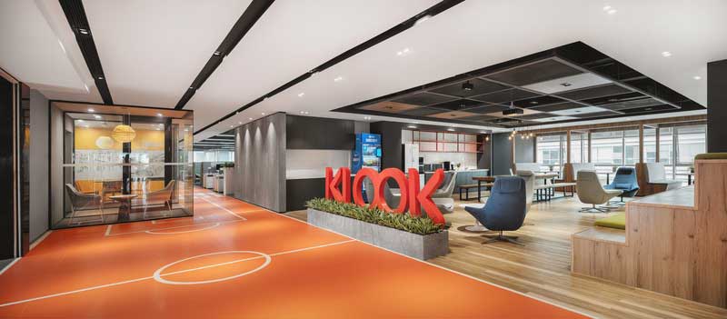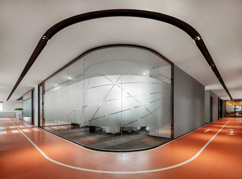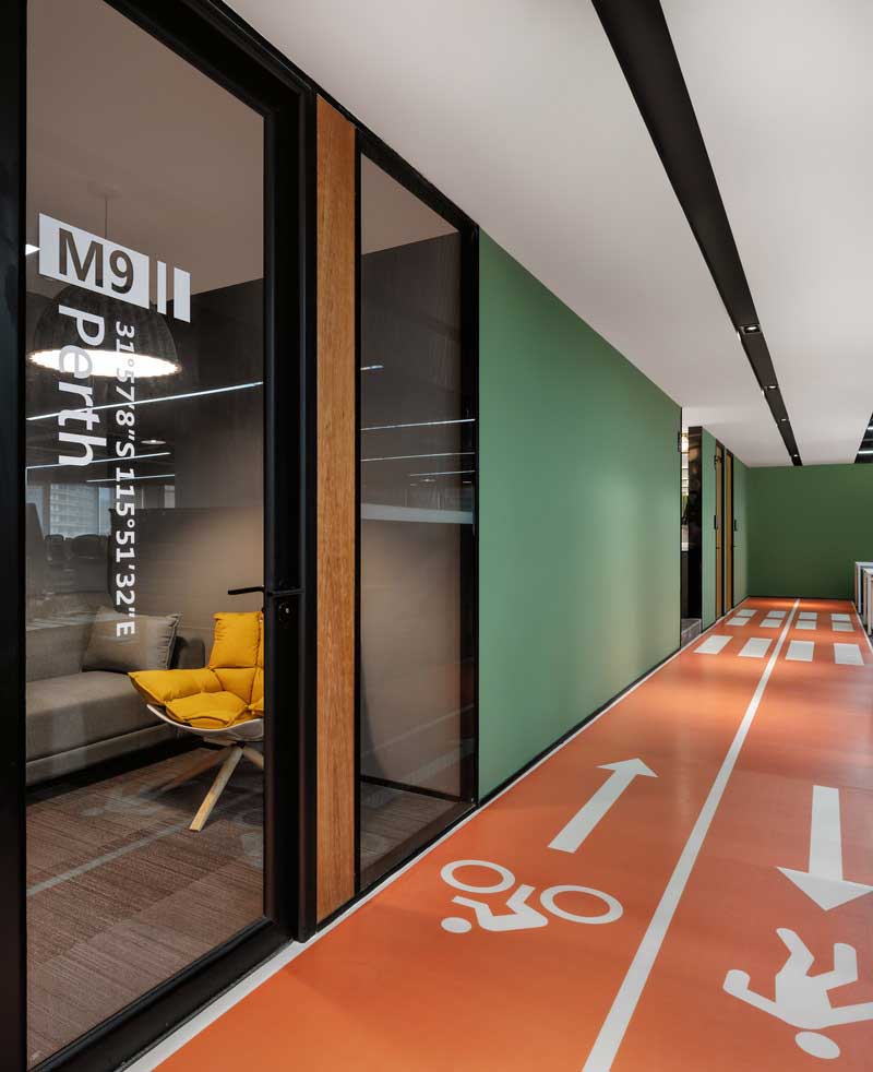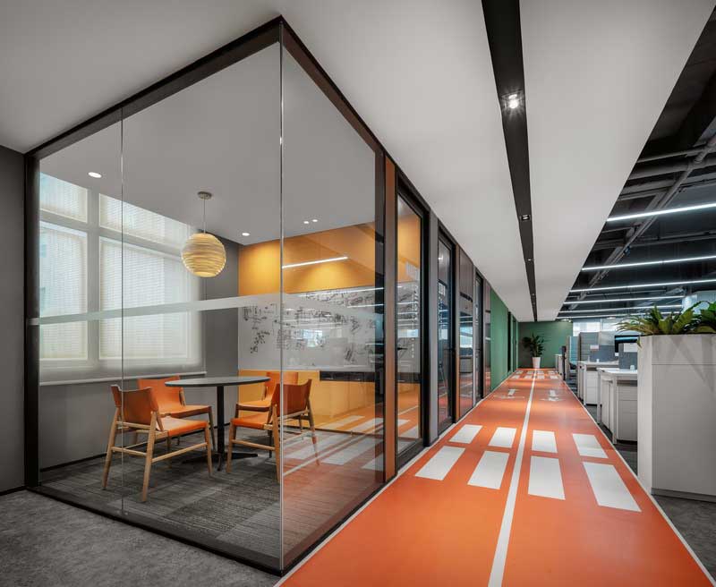 用企業(yè)色彩打造一條貫穿整個辦公空間的旅行跑道,沿路風景一覽無余,各部門及各功能區(qū)域在跑道兩側(cè)延伸,提高空間的工作效率