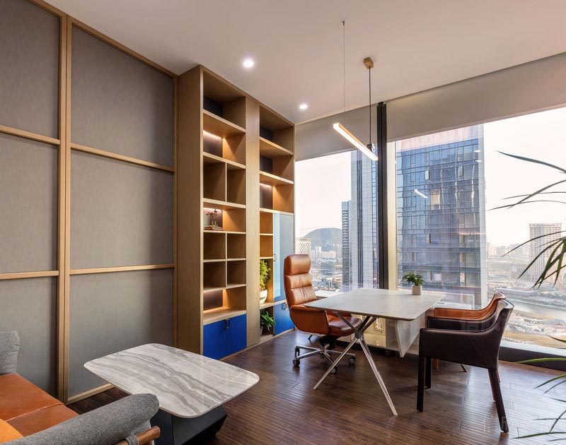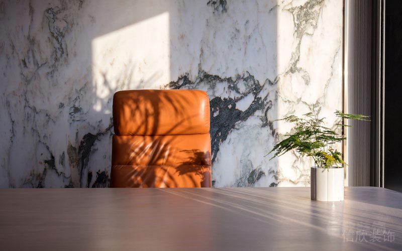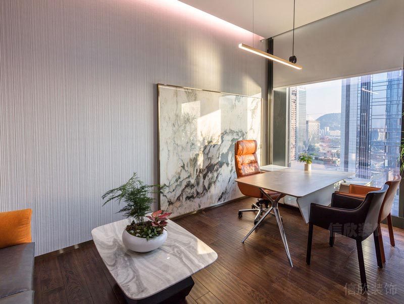 山水大理石背景及橘色辦公椅在夕陽(yáng)下的照耀下,顯得格外迷人。可于繁忙后欣賞窗外風(fēng)光、待客會(huì)友,也是趣事。