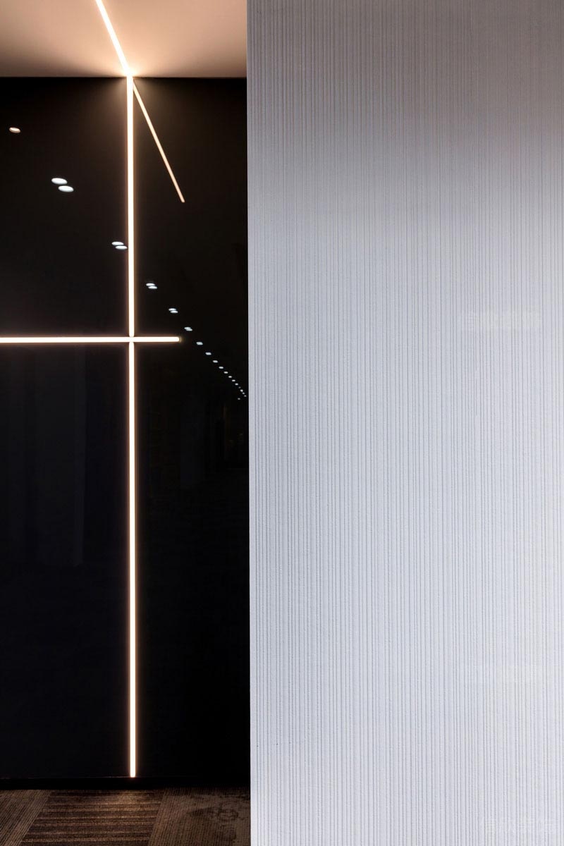 白色的光觸媒磁化板墻面與黑灰色的玻璃形成了黑白顏色對(duì)比強(qiáng)烈的效果,加以點(diǎn)綴線形的嵌入式燈條,更加突出了過(guò)道這一端景特別之處。靈活運(yùn)用了點(diǎn)、線、面多種形式的表現(xiàn)方式,使得畫(huà)面黑、白、灰變化豐富,虛實(shí)層次錯(cuò)落有致,疏密空白安排得體。