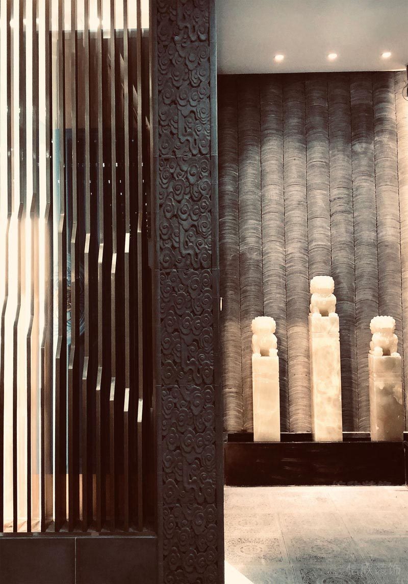 深圳南山現(xiàn)代中式風(fēng)格辦公室玄關(guān)觀景區(qū)屏風(fēng)局部的墻面則是用較現(xiàn)代但又不失古典的水泥石,既延伸了員工辦公區(qū)的現(xiàn)代風(fēng)格,又不破壞入門(mén)過(guò)道空間的調(diào)性,保留了入門(mén)過(guò)道空間的完整性。董事長(zhǎng)室門(mén)垛兩旁傳統(tǒng)祥云的文化圖騰,水景墻面豎貼的灰瓦,及三座白玉的石獅,極大豐富了空間的表情,更加增加了現(xiàn)代中式文化的氣息。